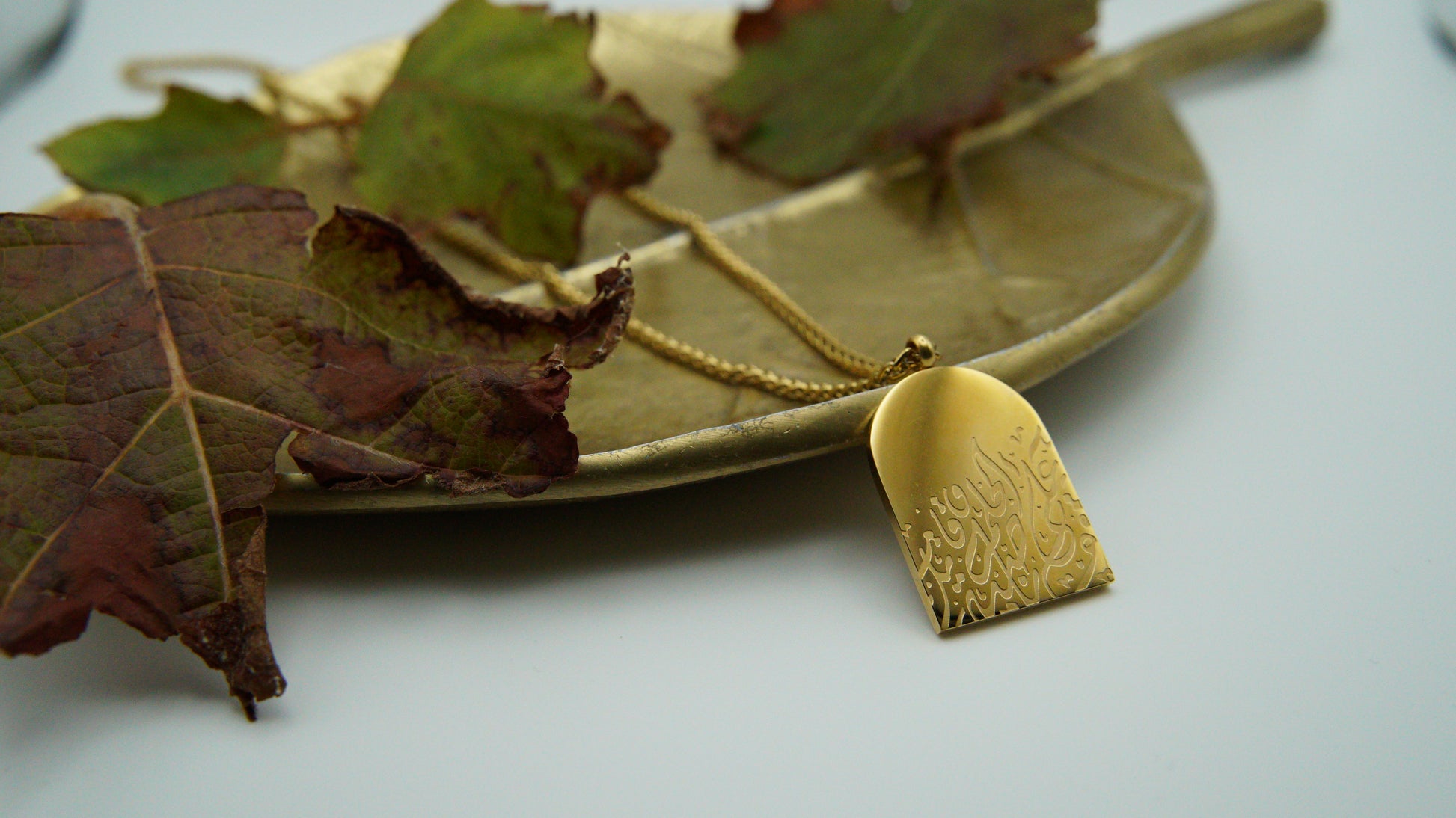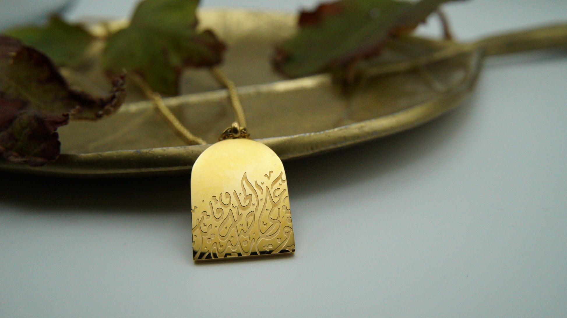 A striking pendant crafted in a graceful arch-like shape, symbolizing strength and resilience. Etched upon it are the powerful Arabic words: