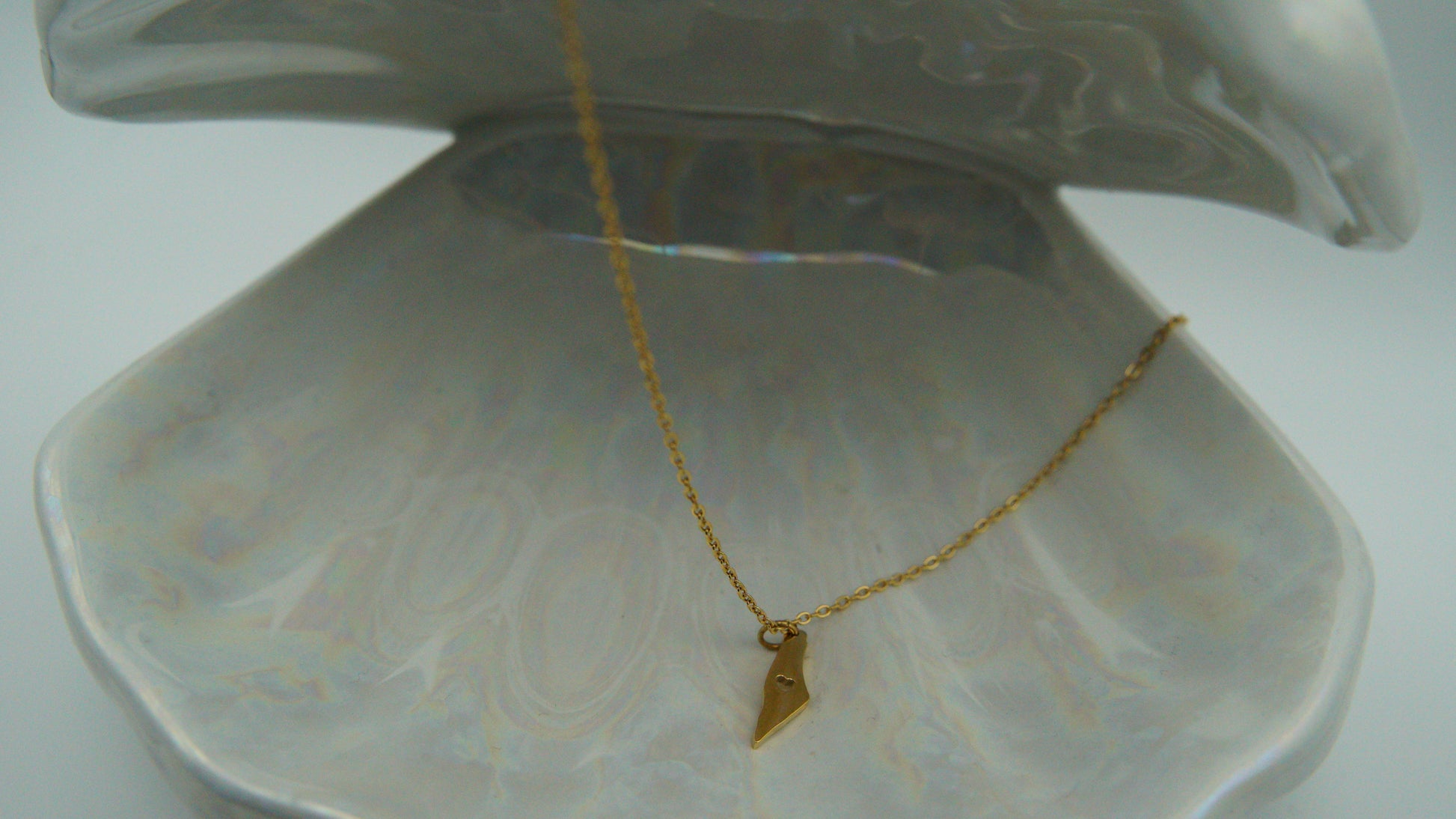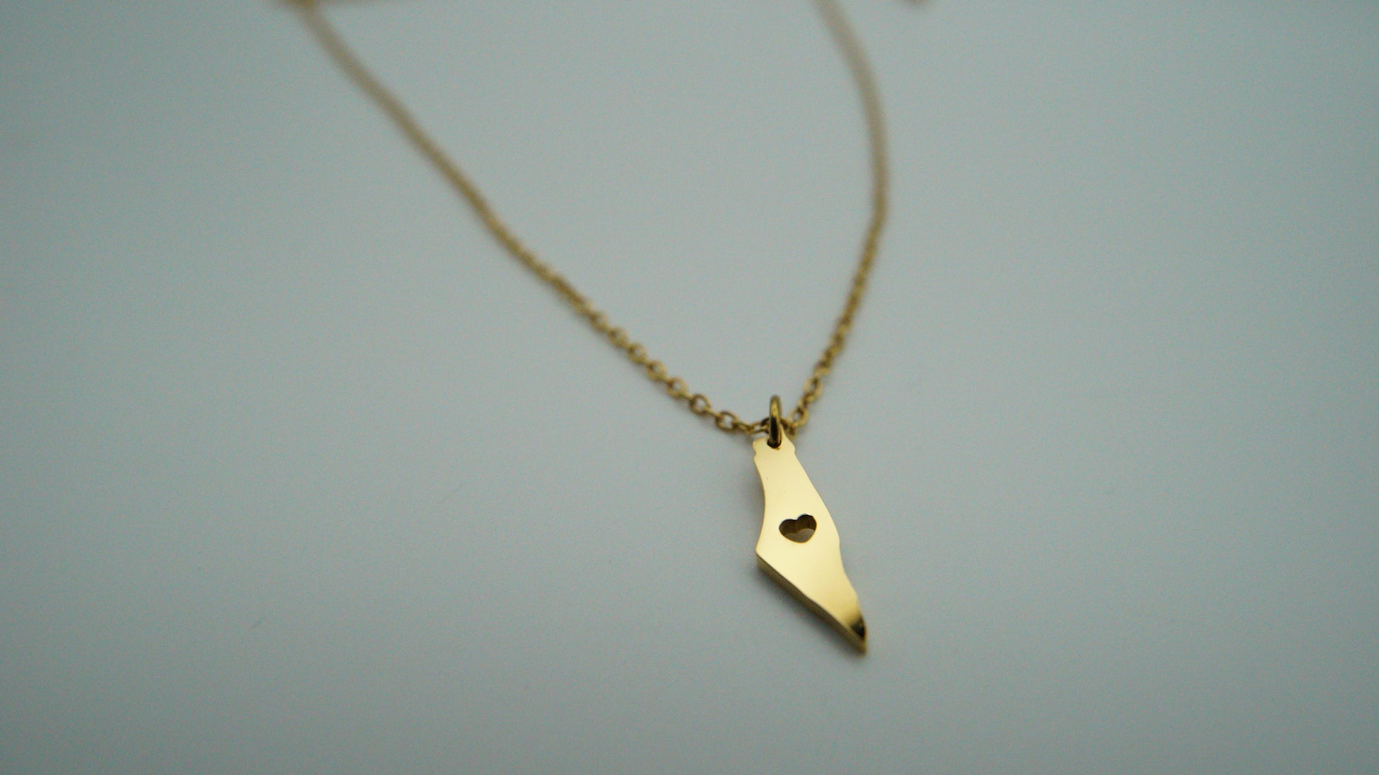 The pendant takes the elegant shape of the Palestinian map in 18k gold Plated, featuring a heart cutout in the middle. Worn close to the heart, this piece carries deep meaning and makes a powerful statement of identity and love.